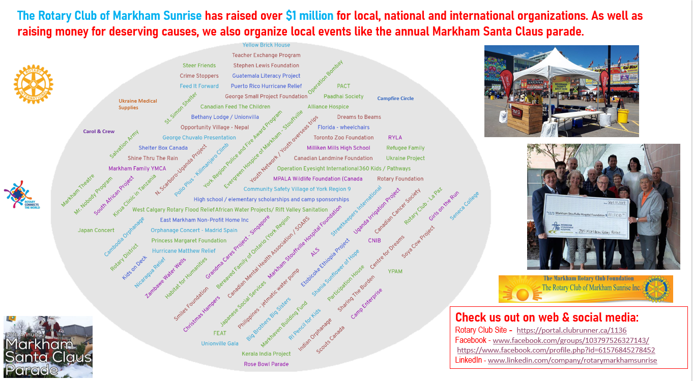 The Markham Sunrise Rotary Club was formed in 1997 to provide service to the Markham community. Our club is one of 25,000 clubs throughout the world with over one million members, striving to help people in need, trying to improve health where disease is rampant, where poverty exists, and providing cultural and educational exchanges to further the ideal of World Peace and Understanding.
