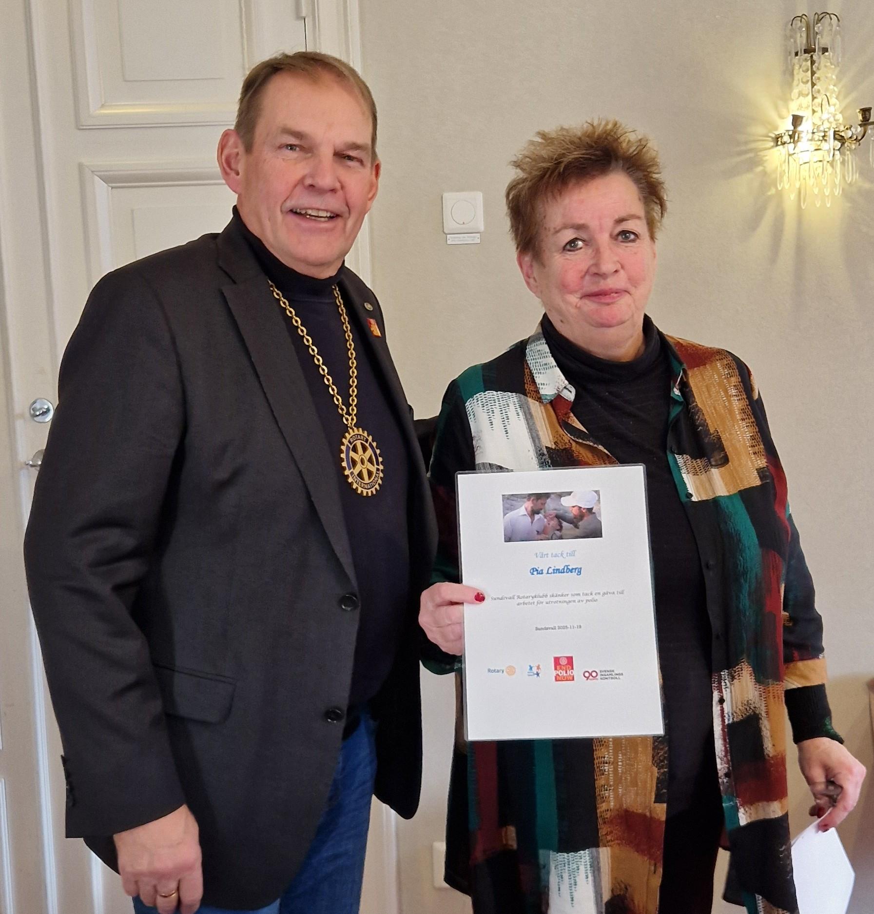 Frank Olofsson från Sundsvall Timrå Airport gästade oss i samband med vår lunch och uttryckte en stor glädje att komma till klubben och få dela med sig av vad som händer med vår flygplats. President Urban Jonsson redogör för vår tackgåva - en insättning till "End Polio Now" - för Frank Olofsson.