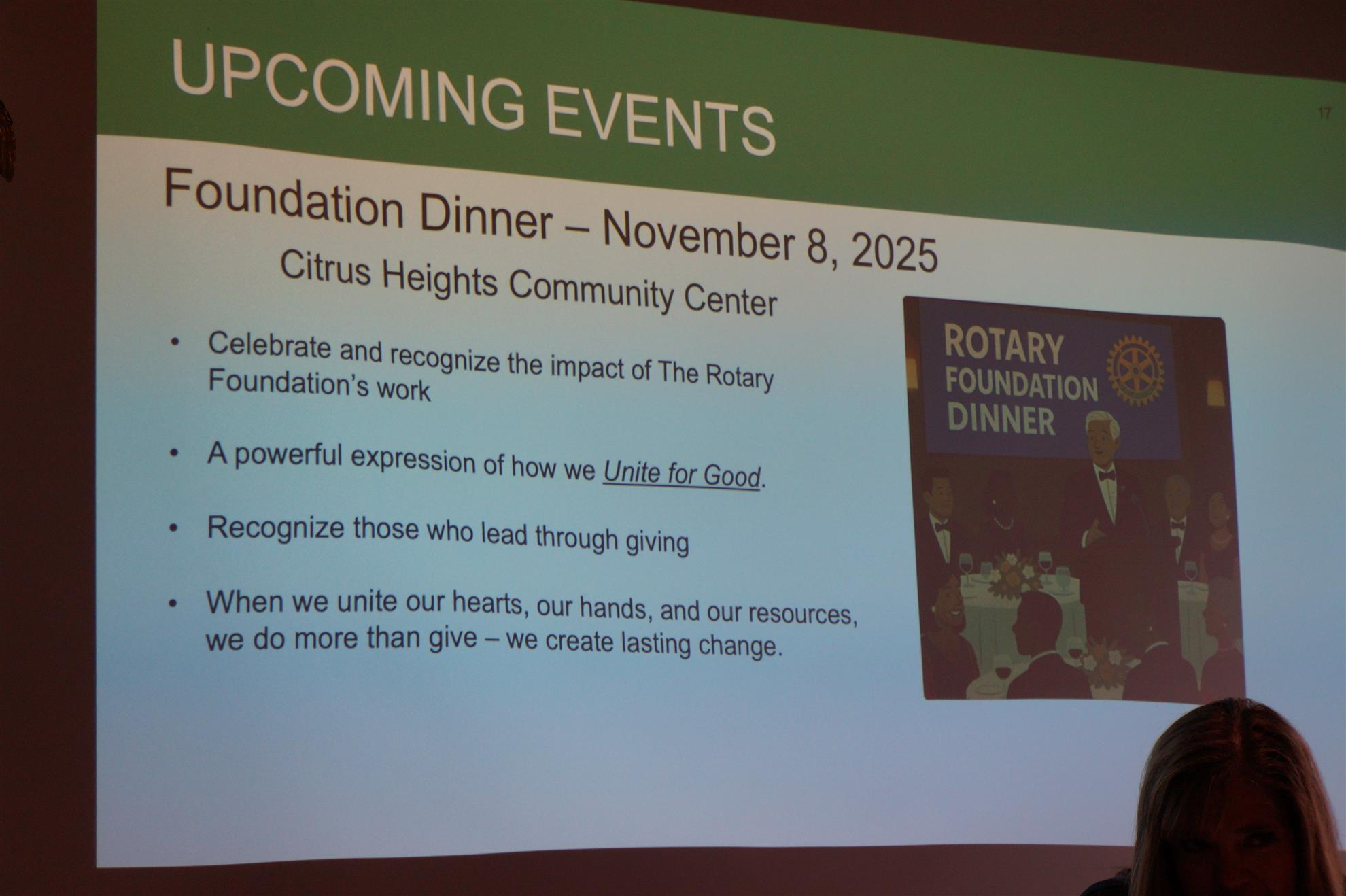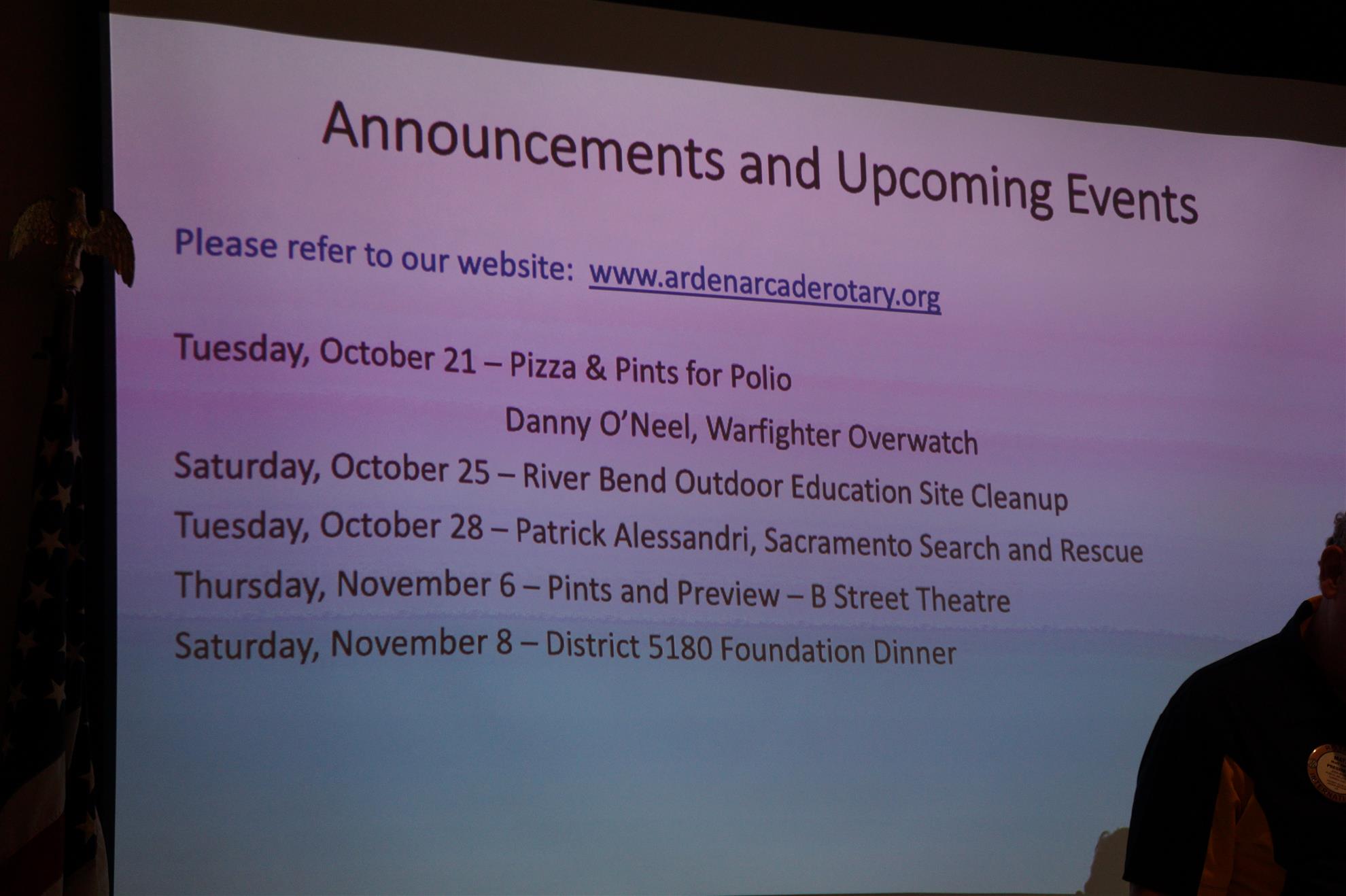 The Prez announced that we have paid for two tables again this year for the District's foundation dinner on November 8th. There is still room as we are trying to get a third table and beat the Downtown club in attendance. It is a fun evening that focuses on the great work Rotary is doing locally and around the world. The event is free for our members and $85 for guests. Please let the Prez know if you are interested in attending.