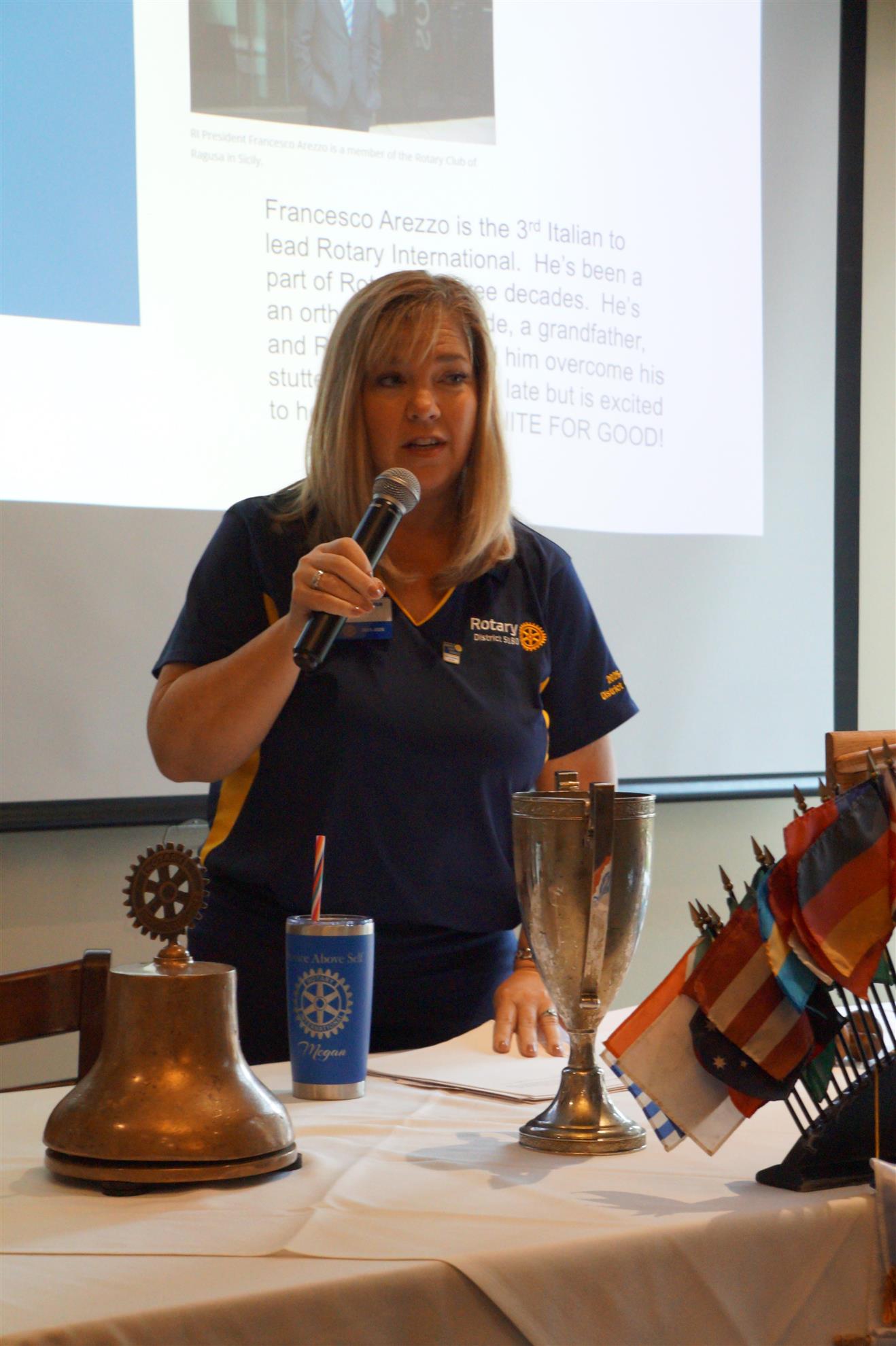Megan asked questions covering Rotary colors, history, inclusion of women, global health initiatives, and recognition awards.