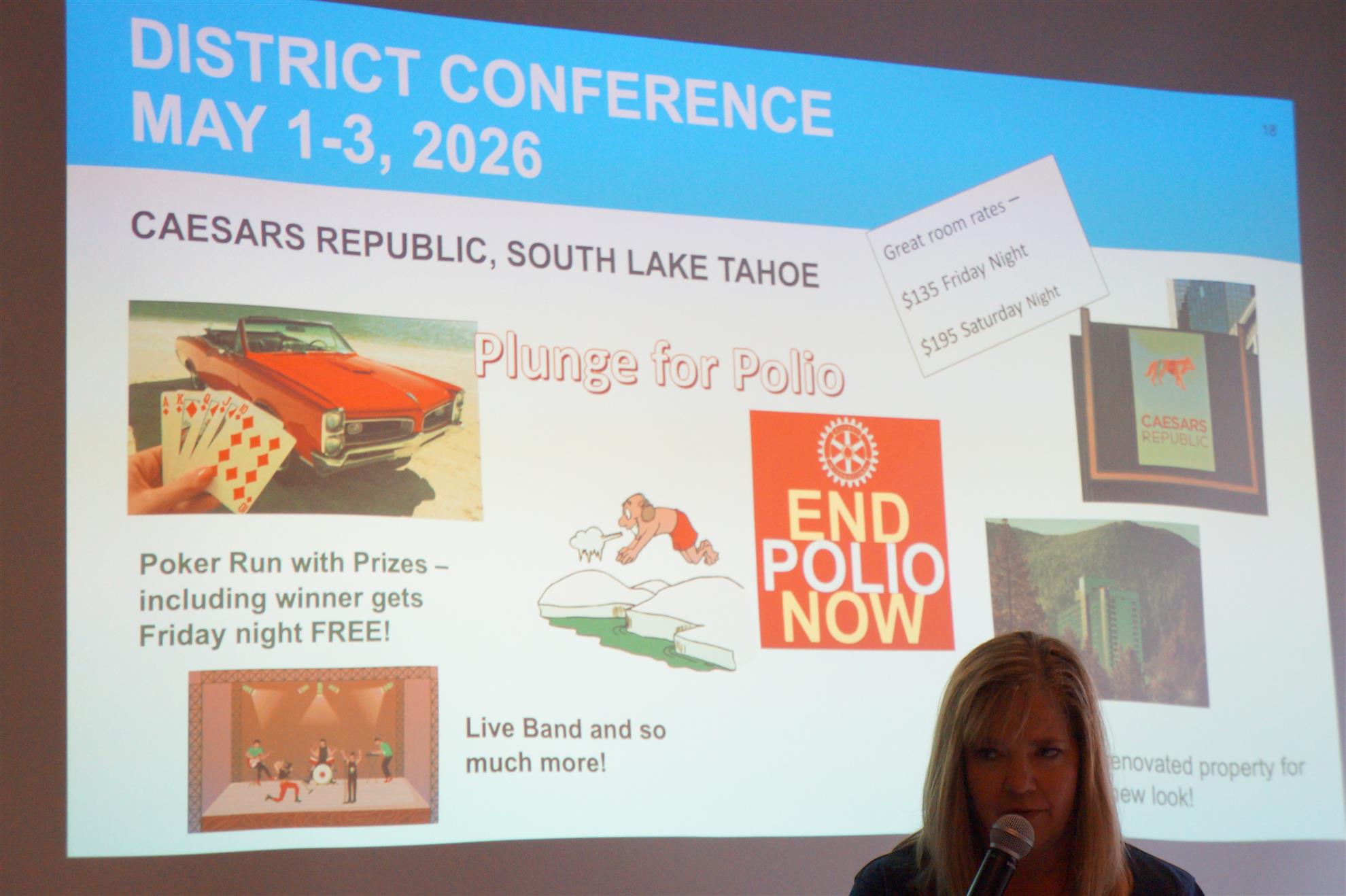 District Conference will be held May 1-3, 2026, at Caesars Republic in South Lake Tahoe with activities including a poker run, polio plunge, comedy night, speech contest, and awards. - Location: Caesars Republic (formerly Harvey's), South Lake Tahoe.