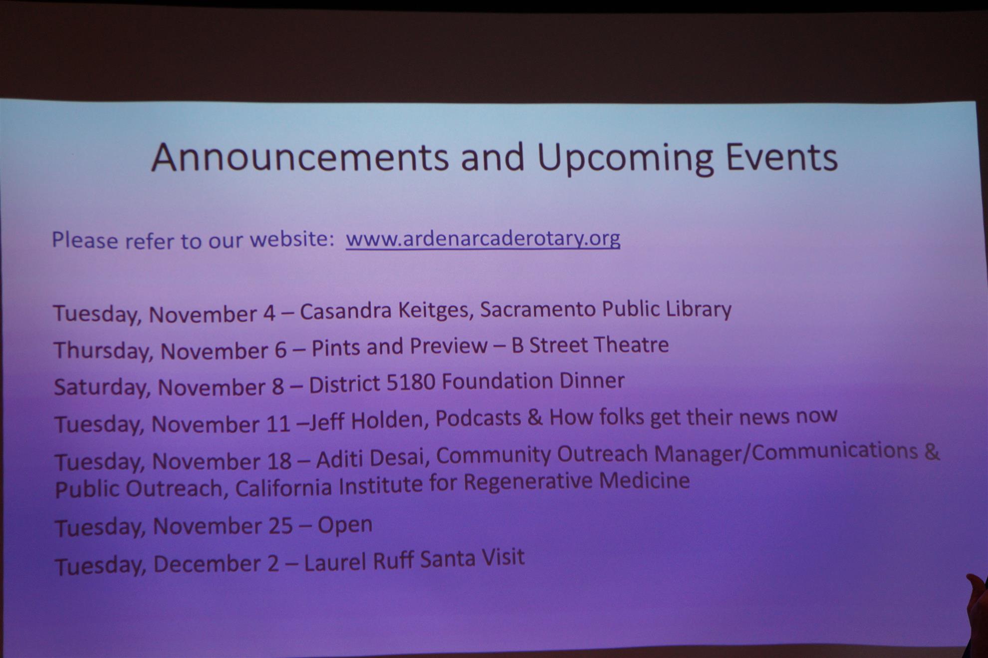The Prez announced that we have paid for three tables, one more than last year, for the District's Foundation Dinner on November 8th. There is room for two more people. It is a fun evening that focuses on the great work Rotary is doing locally and around the world. The event is free for our members and $85 for guests. Please let the Prez know if you are interested in attending.