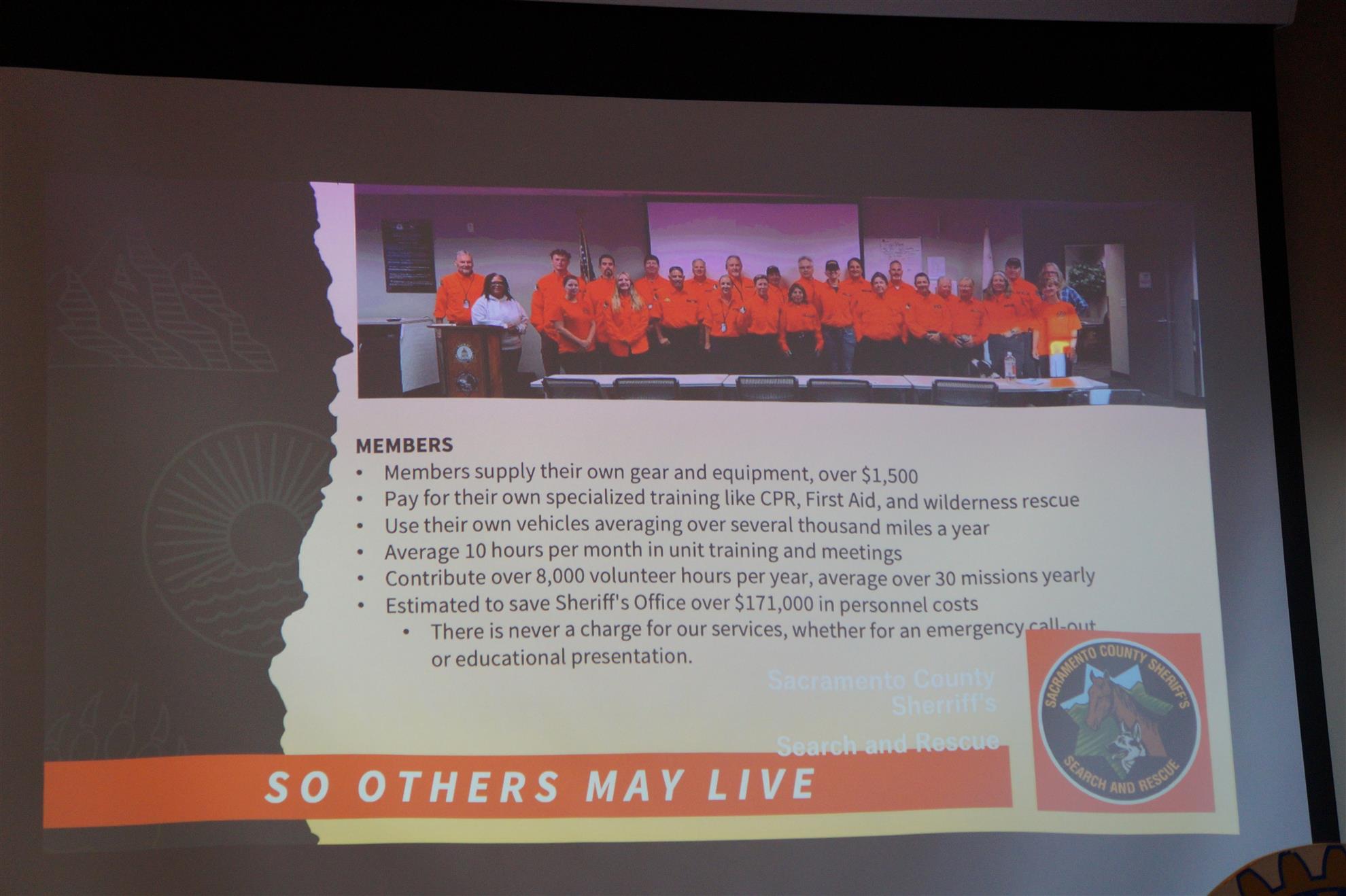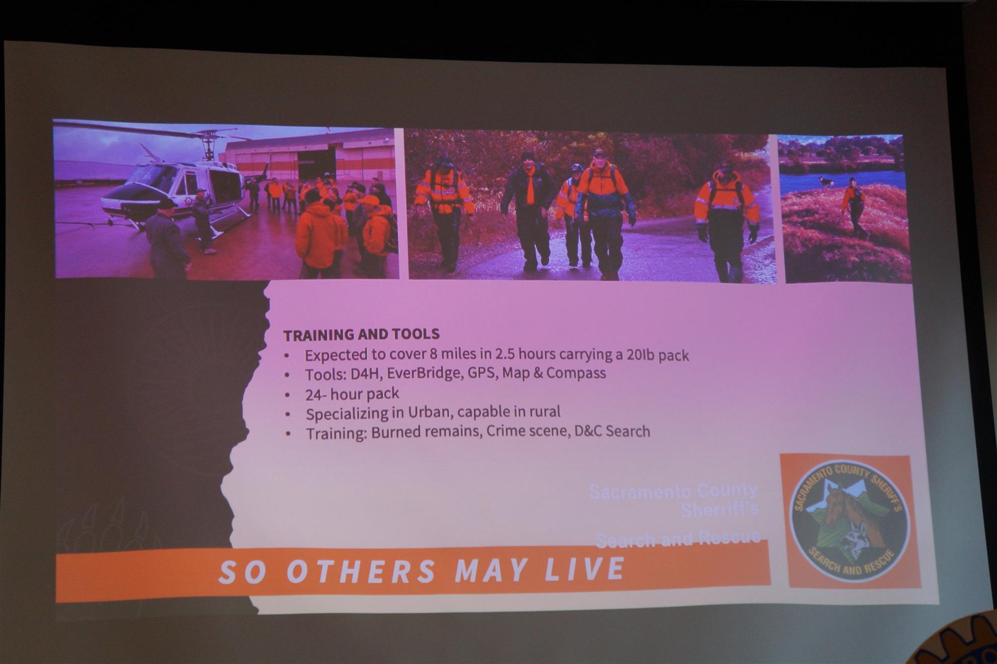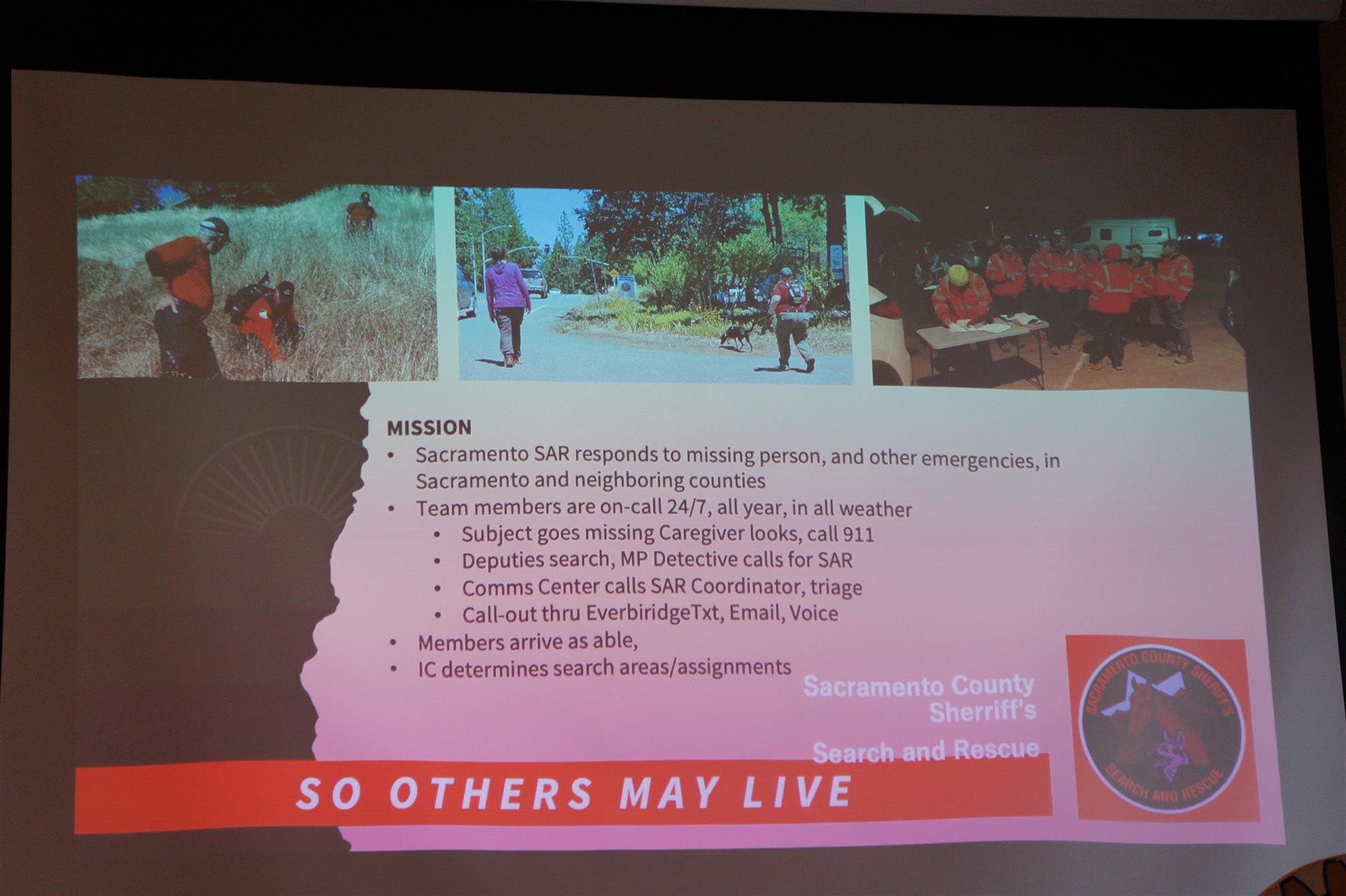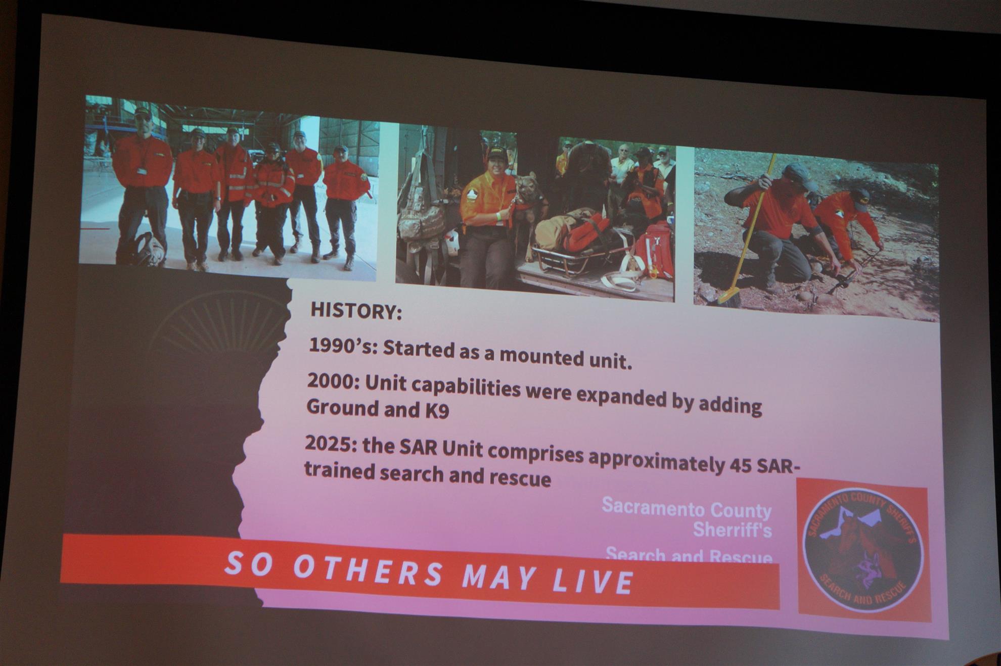 - SAR operates under the Sheriff's Special Operations Bureau; scuba diving teams are separate.