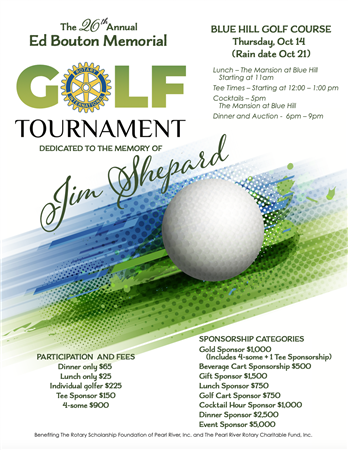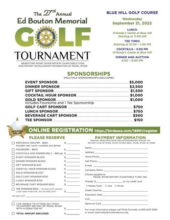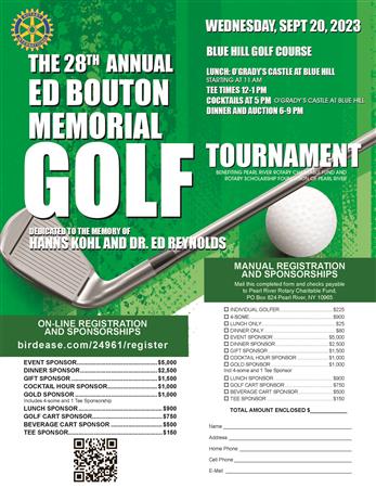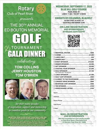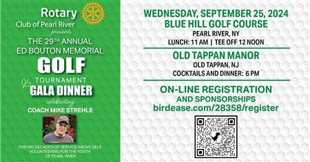 The Rotary Club of Pearl River invites you to the 29th Annual Ed Bouton Memorial Golf Tournament and Gala Dinner, benefiting the Pearl River Rotary Charitable Fund and the Rotary Scholarship Foundation of Pearl River.