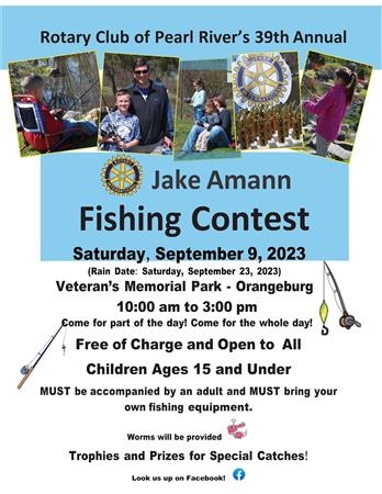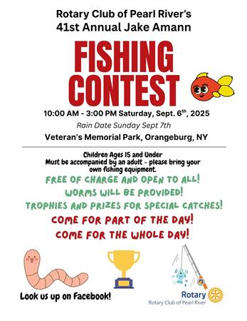 On Saturday, September 18, 2021, the Rotary Club of Pearl River will be holding its 37th Annual Jake Amann Fishing Contest at Veteran's Memorial Park in Orangeburg, New York, from 10 a.m. to 3 p.m. There will be a rain date of Saturday, September 25. Feel free to attend for the whole day or part of the day.