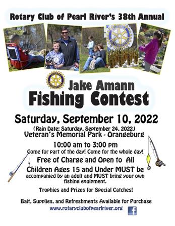 The Rotary Club of Pearl River will hold the 36th Annual Jake Amann Fishing Contest on Saturday, September 12, 2020, from 10:00 a.m. to 3:00 p.m. at Veteran’s Memorial Park in Orangeburg.