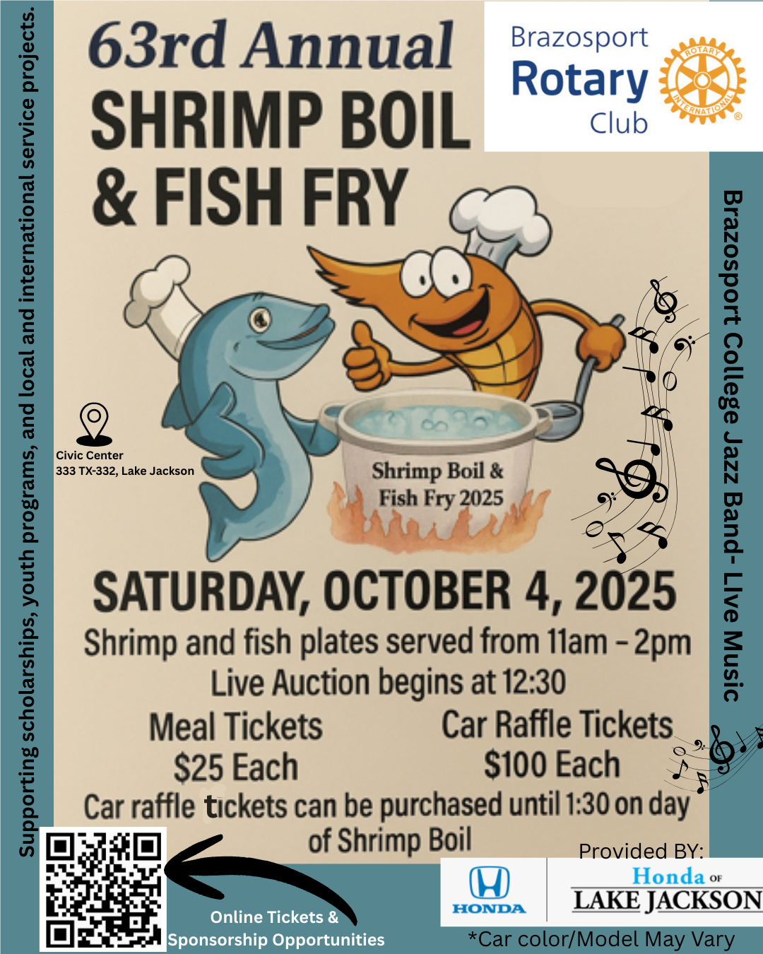 Meal tickets are $20 each and car raffle tickets are $100 each. We will have a live and silent auction as well as the drawing for a 2024 Honda Accord donated by Honda of Lake Jackson. Drive-thru or dine-in meals include gluten free fish and shrimp with corn and potatoes.