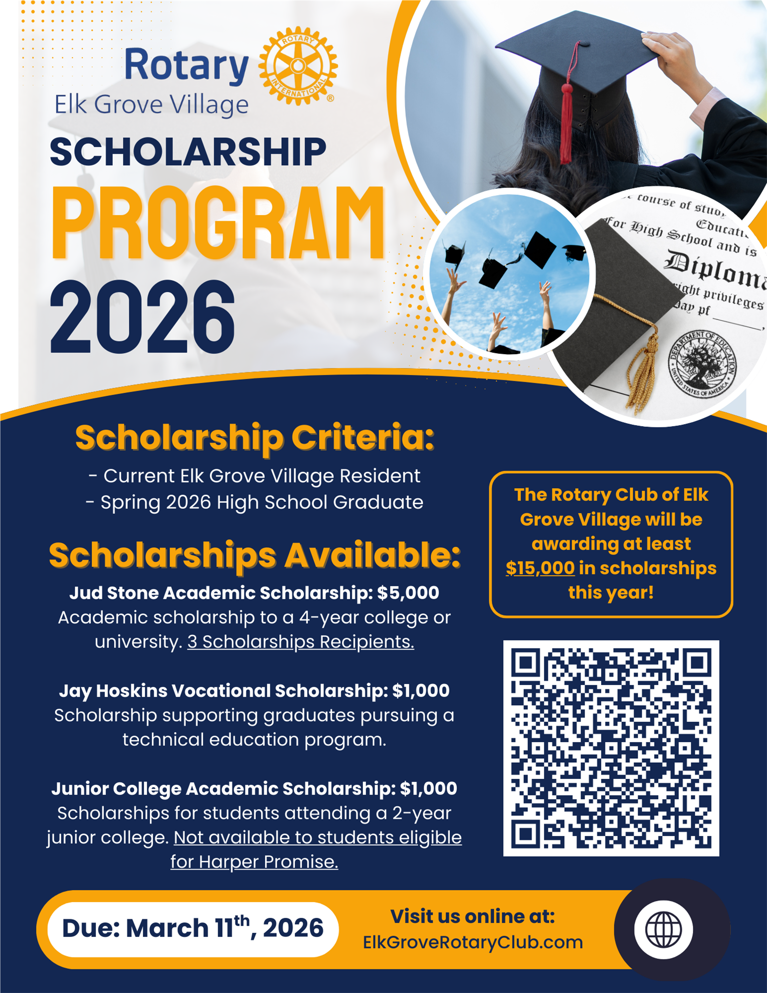 If you know a Elk Grove Village resident graduating from high school and is continuing their education please notify them of this Scholarship opportunity. The largest scholarship this year will be $5,000. Students should submit their application now to see if they are one of the lucky ones to be awarded a scholarship this year. See the official application for all of the criteria and rules.Apply Now for 2026 Scholarship