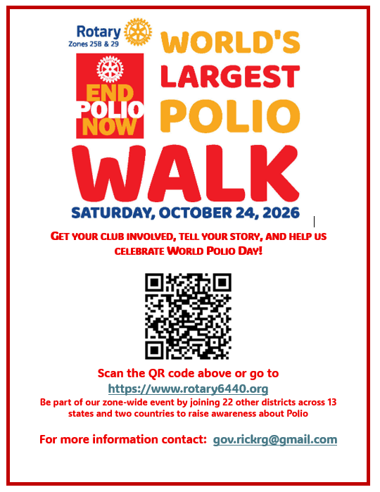 Rotarians from Zones 25b & 29 will be participating in the World's Largest Polio Walk by joining forces to walk together at 10 a.m. CDT for an end to polio.