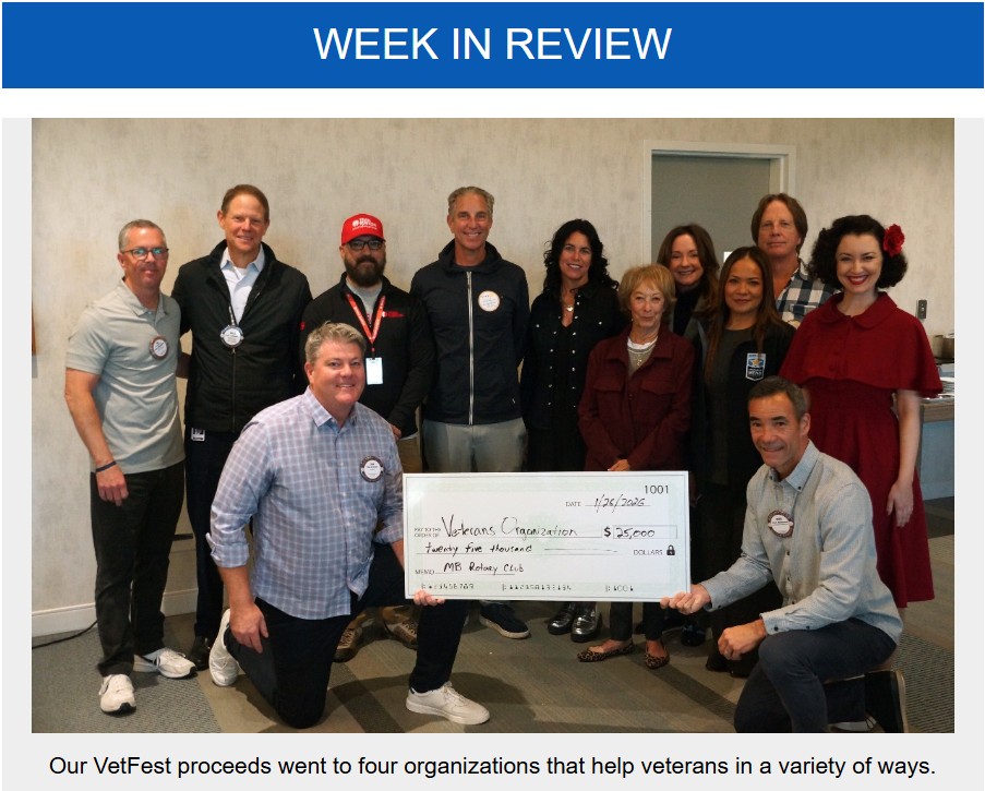 President Cedric thanked Steve DeBaets for his shoes donation project in Long Beach, Norm Levin for his work with Pin-Up for Vets and Val Pagett for visiting a Rotary Club in the Canary Islands. Barbara Matles announced her retirement and President Cedric and his wife Gretchen attended Ponies for Polio, a Rotary District event.
