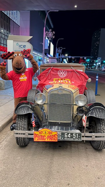 "The "Ascent to Mount" Edmonton was a success, with Arlington Rotarian, Wally Thomas, joining the Miss Vicky driving team. Encountering some winter weather at Rogers Pass, MV arrived in good shape. Three presentations were well received and Miss Vicky stood tall at the Oil Kings hockey game, defeating the Americans /Tri-Cities team. Rotarian Maelle Toews and her husband shepherded the Ford to the coziness of a heated hangar provided by Ms. Jeanette at Villeneuve Airport. Thanks to all for many courtesies. Over $7,000 toward Miss Vicky's third $25k challenge check!"