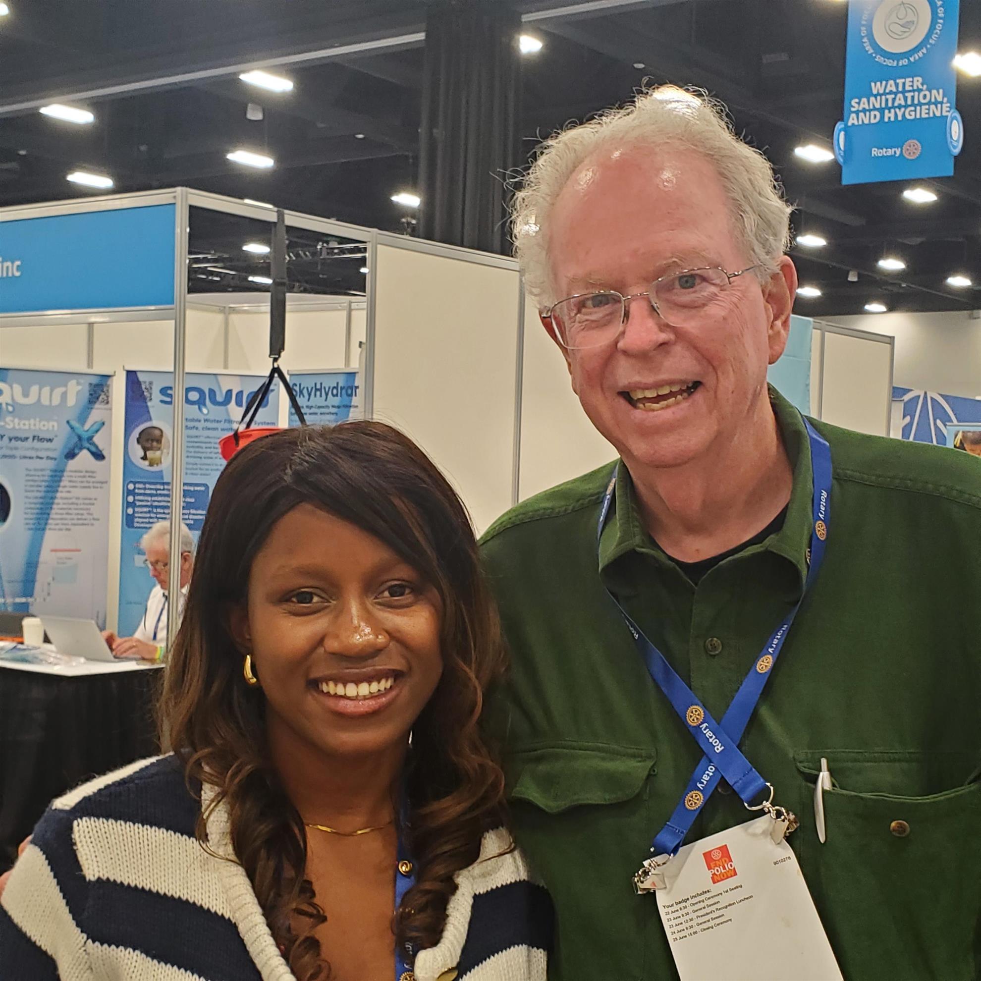 John with Anita from Uganda at the June 2025 Rotary International Convention in Calgary. The Rotary Club of Bellingham partnered with a club in Uganda to provide water and sanitation and hygiene facilities in a rural area in response to flooding which contaminated their drinking water.