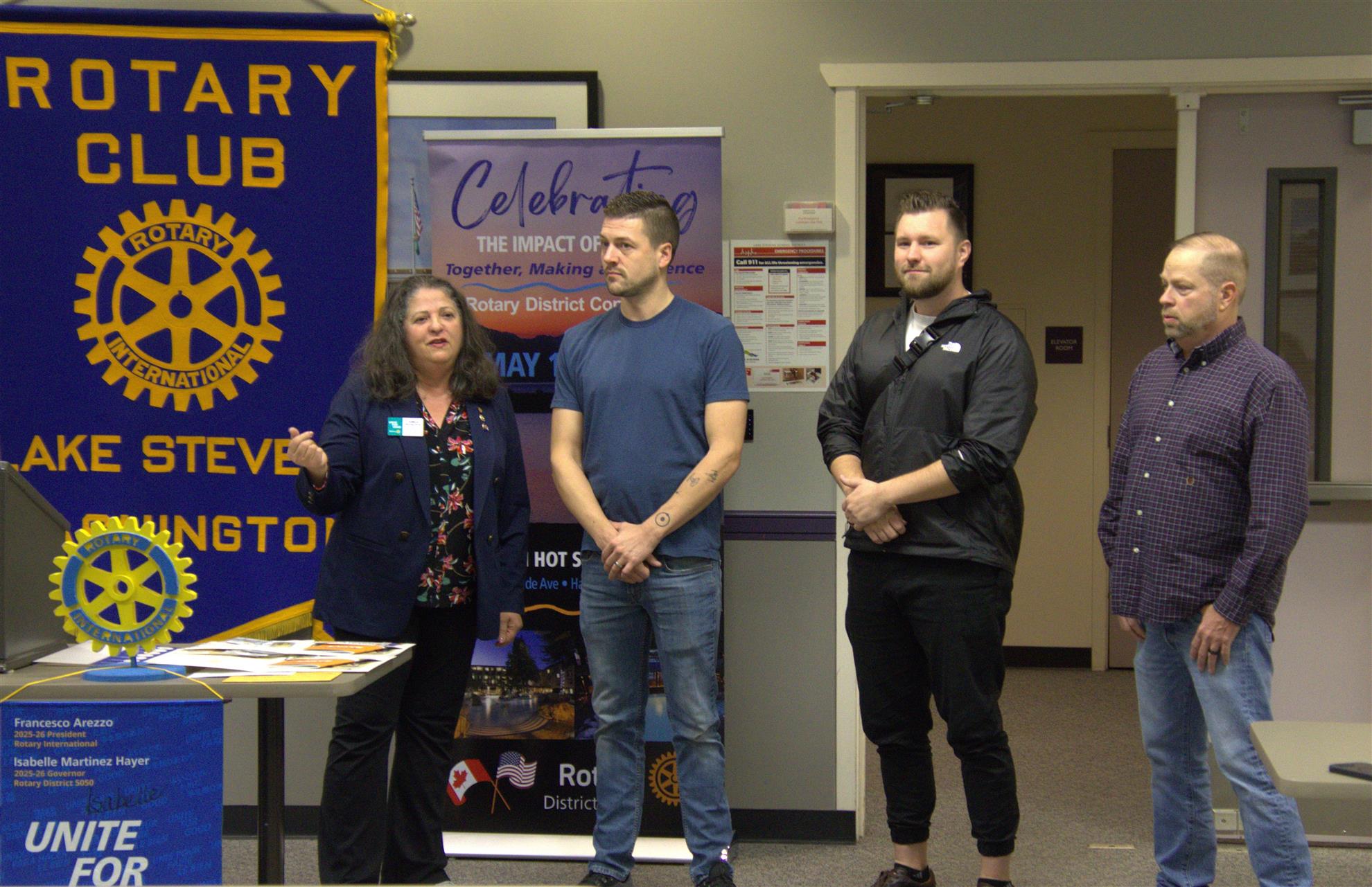 District Governor Isabelle Martinez Hayes welcomes new members Alex Wells and Kyle Sylliaasen to the Lake Stevens Rotary and present them with their membership packets. The District Governor commented about the Rotary International community and the importance of being involved in Club activities.