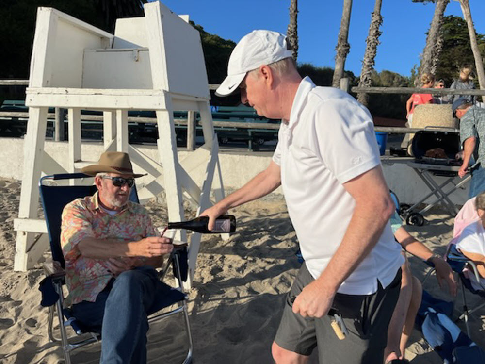 Rotarians Steve and Cindy Davis, Paul and Sue Kremser, Andy and Meri Berwick, Cathy Cash, Bruce McRoy, Tony Morris, Karen Hickman, Murray Ray, Bernadette Bagley, Kurt Koenig, and Kim Stone (with son Brandon and her French exchange student) gathered at Hope Ranch Beach to relax oceanside while sharing stories, drinking wine, and feasting.