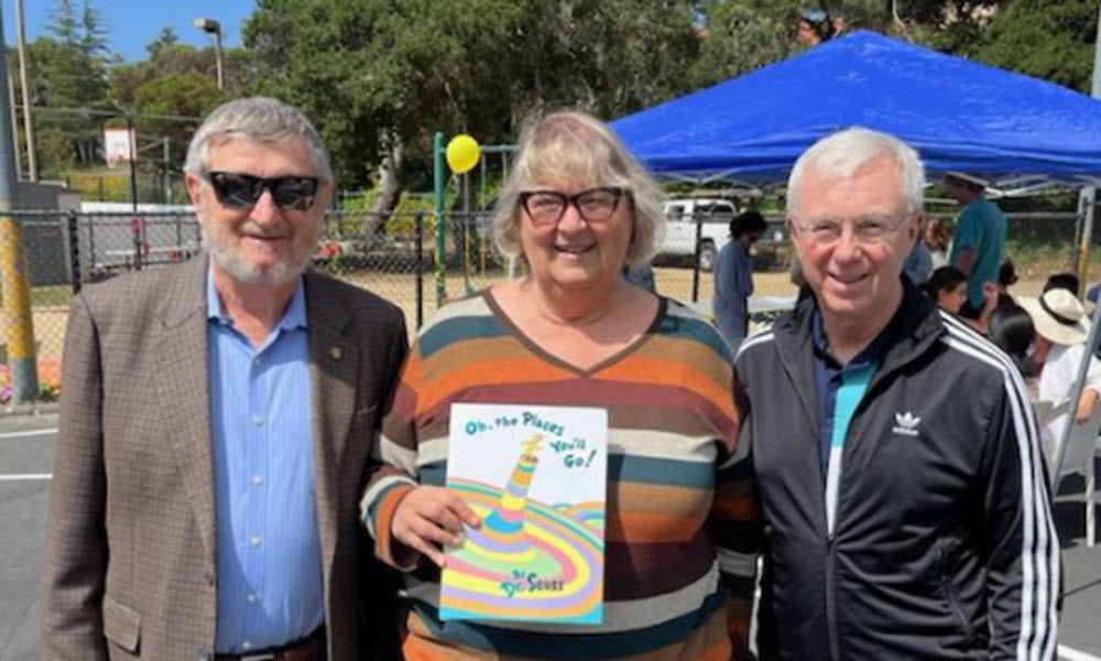 Rotarians Murray Ray, Bernadette Bagley, and Roger Davis with a copy of the book given to all preschool graduates.