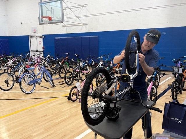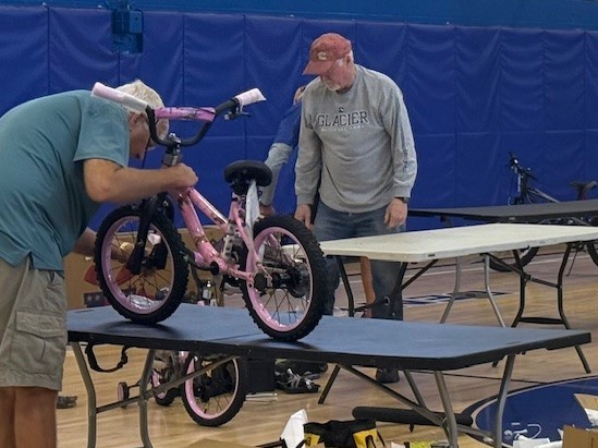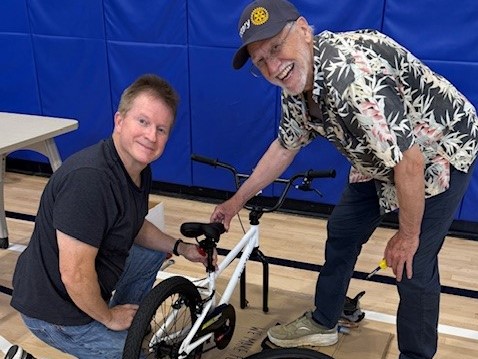Rotarians rolled up their sleeves to assemble 69 bicycles for local kids.