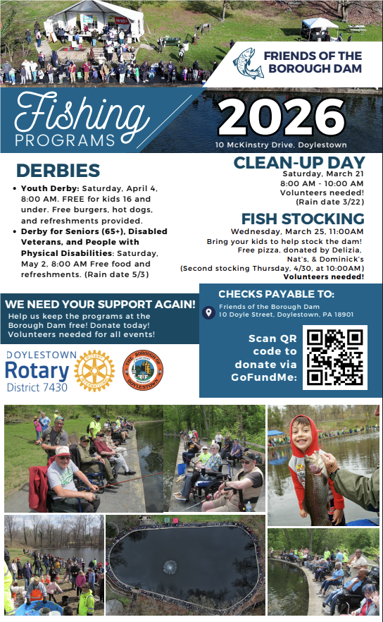 Borough Dam Cleanup is the community coming together, with our rotary club leading the way, to spruce up the area around the fishing pond at the old Borough Dam next to Fannie Chapman pool. Please bring your own gloves and if you have a rake, shovel or maybe a wheelbarrow please bring them as well. Please remember to mark what you bring so it makes its way back to the correct owners.