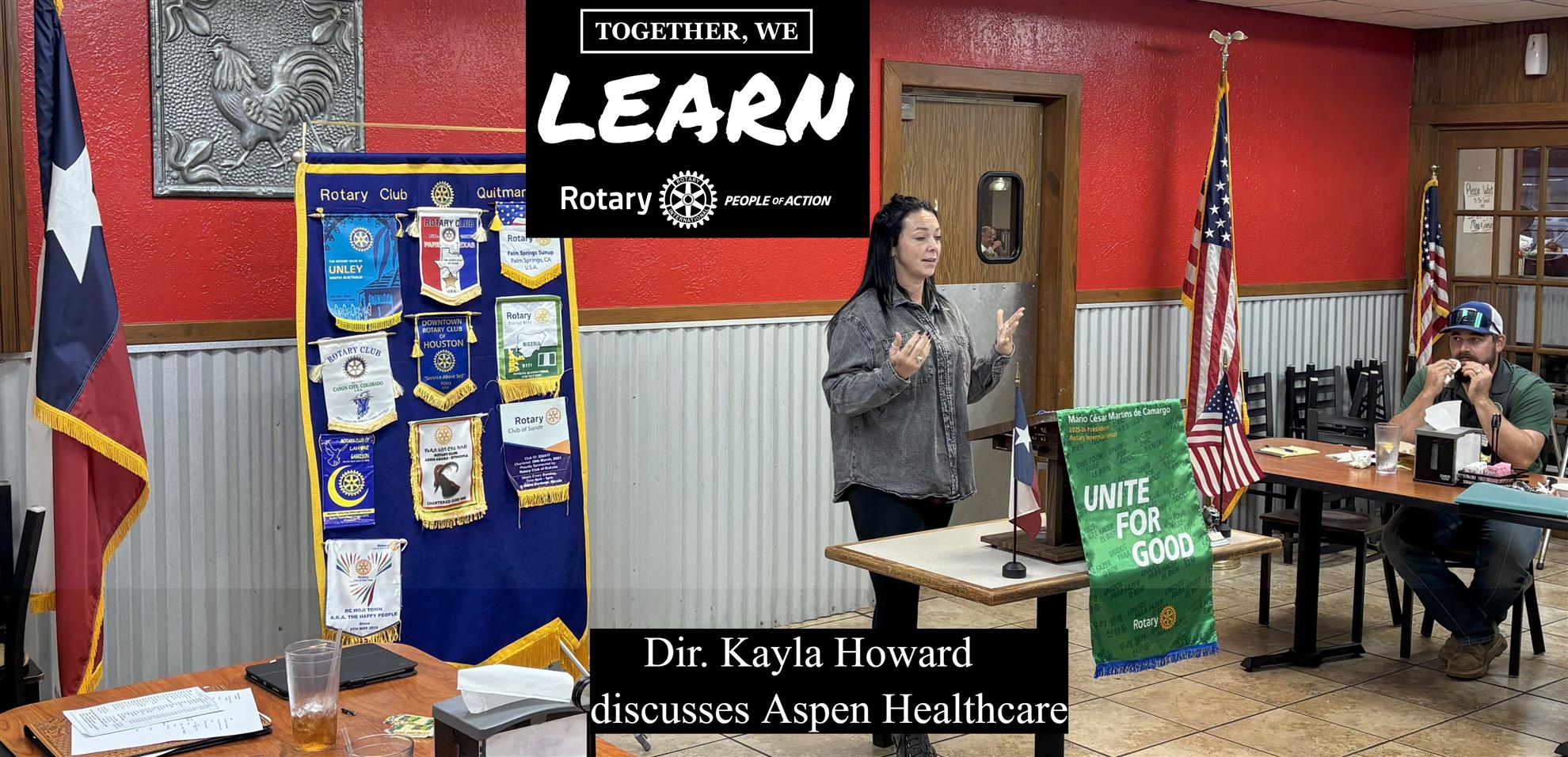 Director Kayla Howard from Aspen Healthcare presents their hospice services to Quitman Rotary Club as Carson Turner (arranged today's program) looks on.