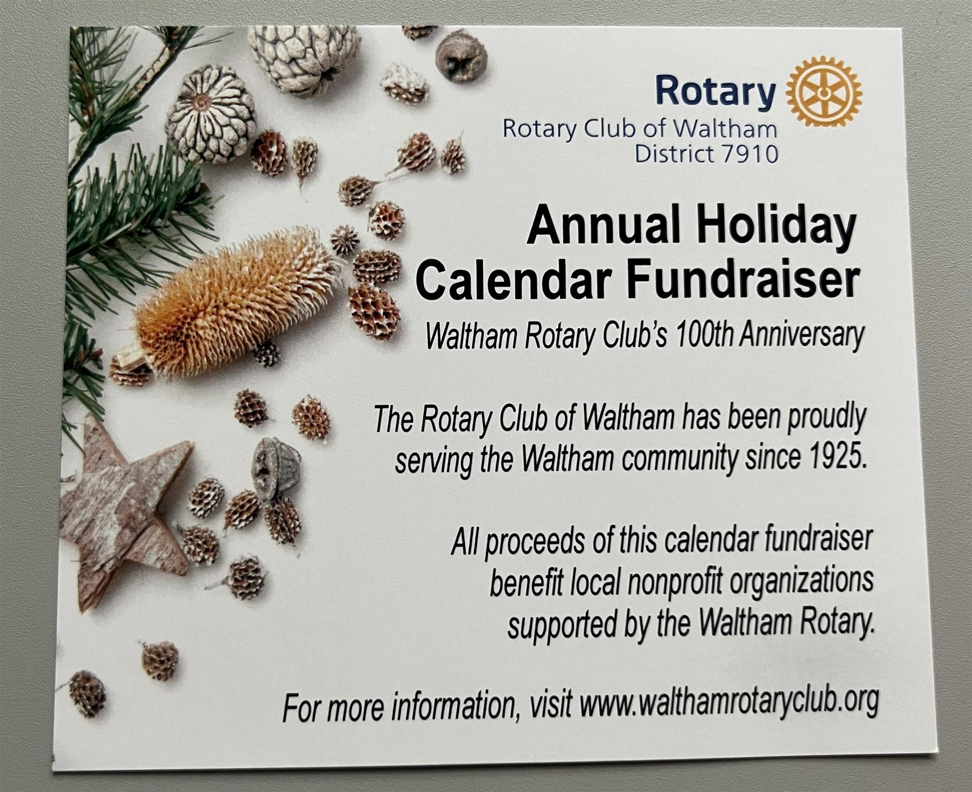 If you don't have 30 calendars to sell, you should! And if you have sold 30 calendars already - congratulations! Come get more! This fundraiser is a great way to start the conversation about Rotary with someone who just might be our favorite new member. Please consider promoting the calendars at your business or in a community newsletter, page, or site. We have LOTS of them to sell and every one is 31 chances to win $100. As you must know, all of our fundraising goes to support the grants Waltham Rotary makes at the end of our fiscal year. Let's get selling!