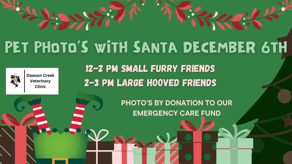 Pet photos with Santa will be happening this year on Saturday Dec 6th from 12-3 pm right here at our Large Animal clinic