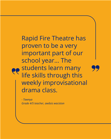 To directly address these deficits and focus on the whole student, our club has provided crucial funding for a school-year long Rapid Fire Theatre Improv School Residency at awâsis waciston School. This powerful program uses the art of improvisation to rebuild the foundational confidence and connection points students need, ensuring they gain skills that extend far beyond academic subjects.