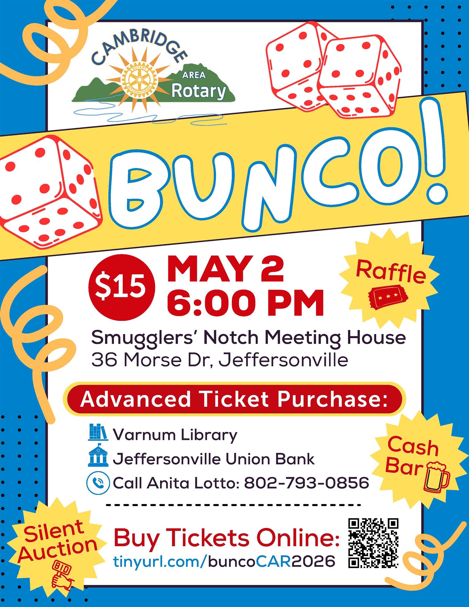 The Cambridge Area Rotary is hosting a FUNdraiser event to support club activities. Please join us for a night filled with BUNCO, Silent Auction, Prizes, Raffles. There will be snacks and a cash bar for beer and wine at the event. Tickets are $15 and are available at Varnum Library, Union Bank Jeffersonville, Anita Lotto (802)793-0856 or any Cambridge Area Rotarian.