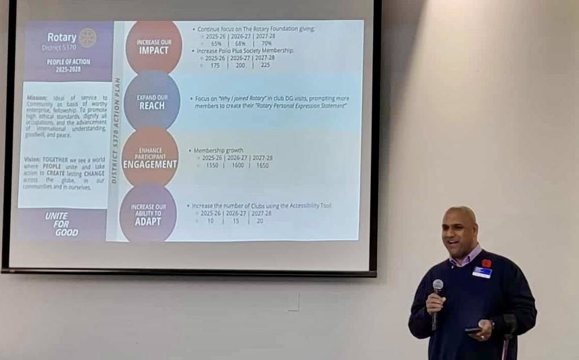 Ramesh Ferris, the current District Governor, presented how District 5370's plan focuses on four main areas, with specific goals for the coming years: