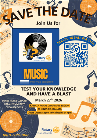 The Rotary Club of Kanata is excited to announce the return of our annual Music Trivia Night, happening on Friday, March 27, 2026.