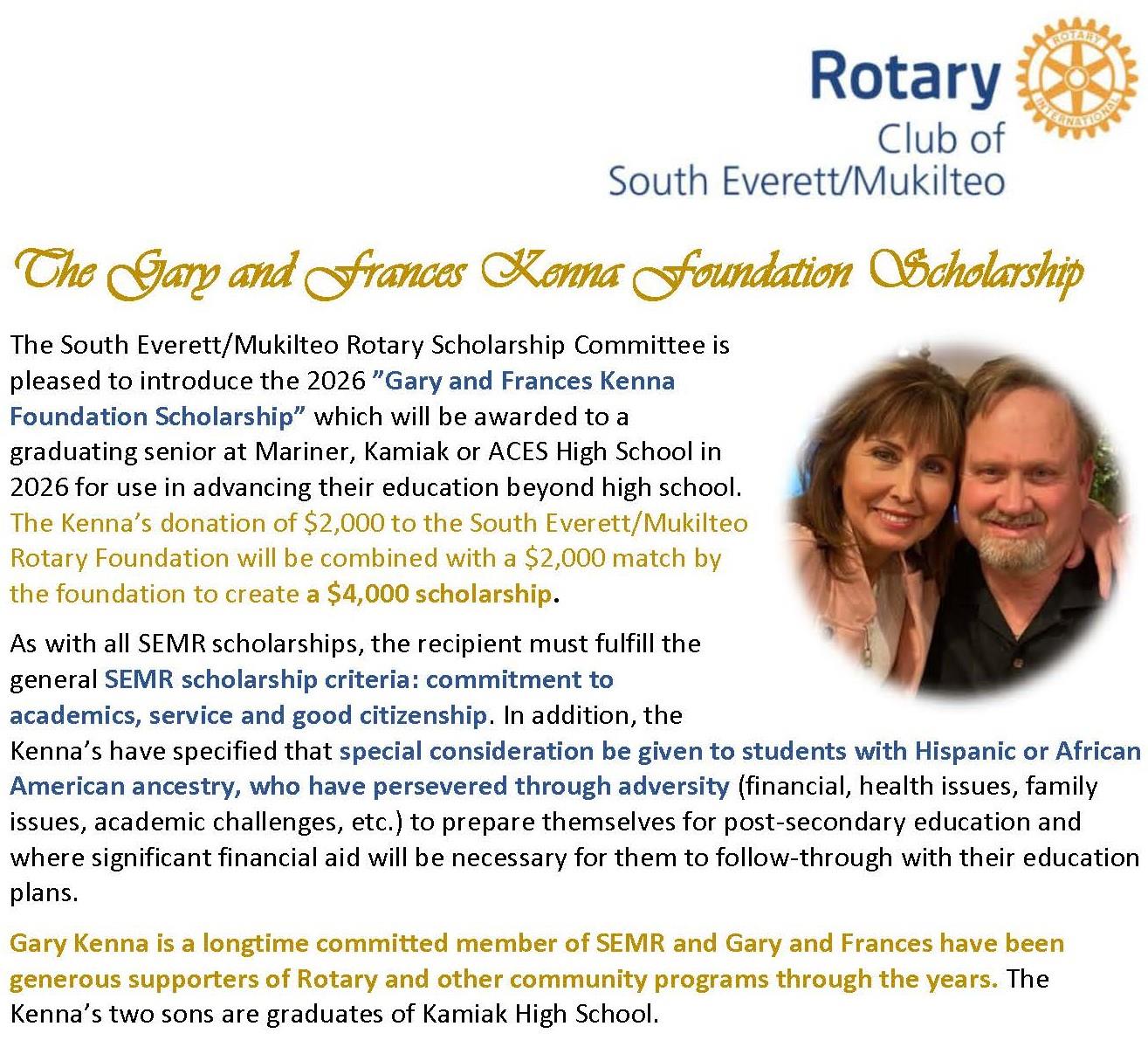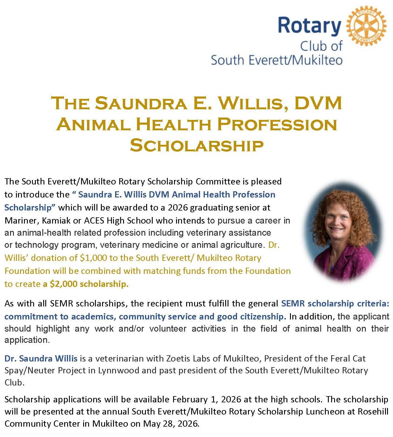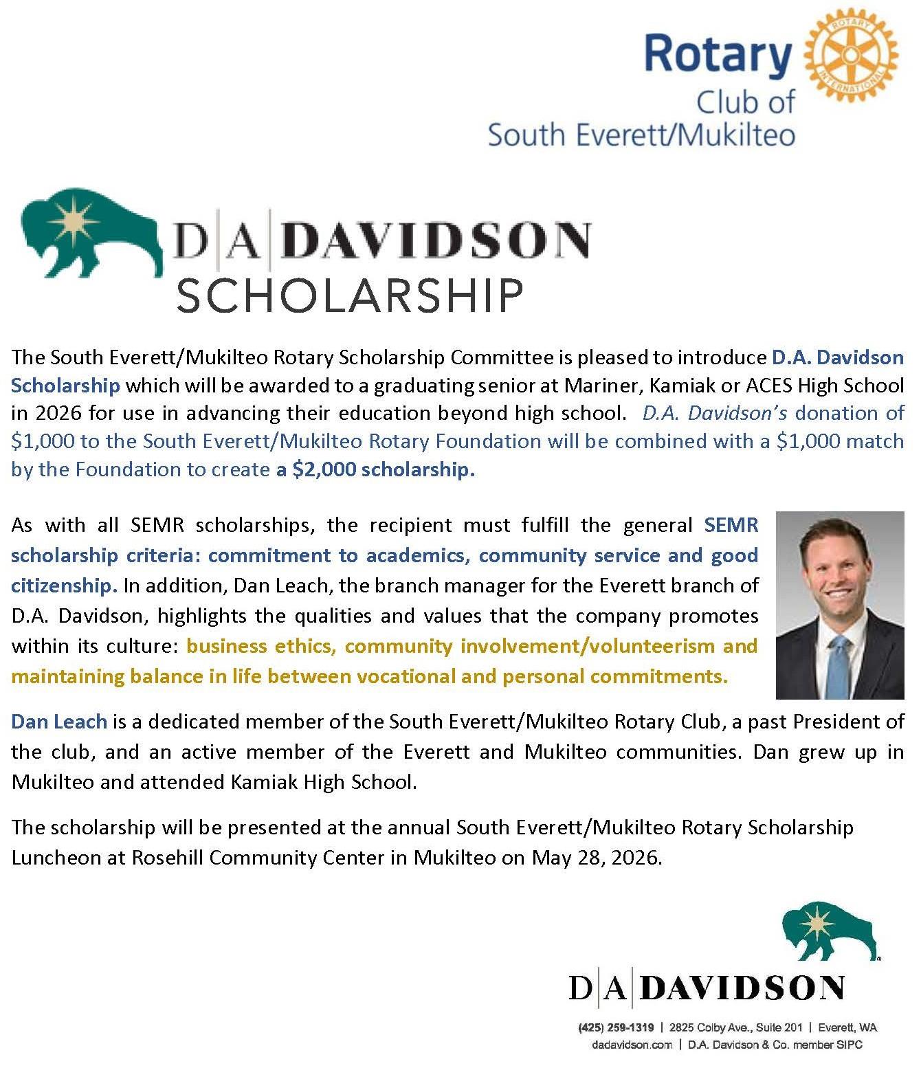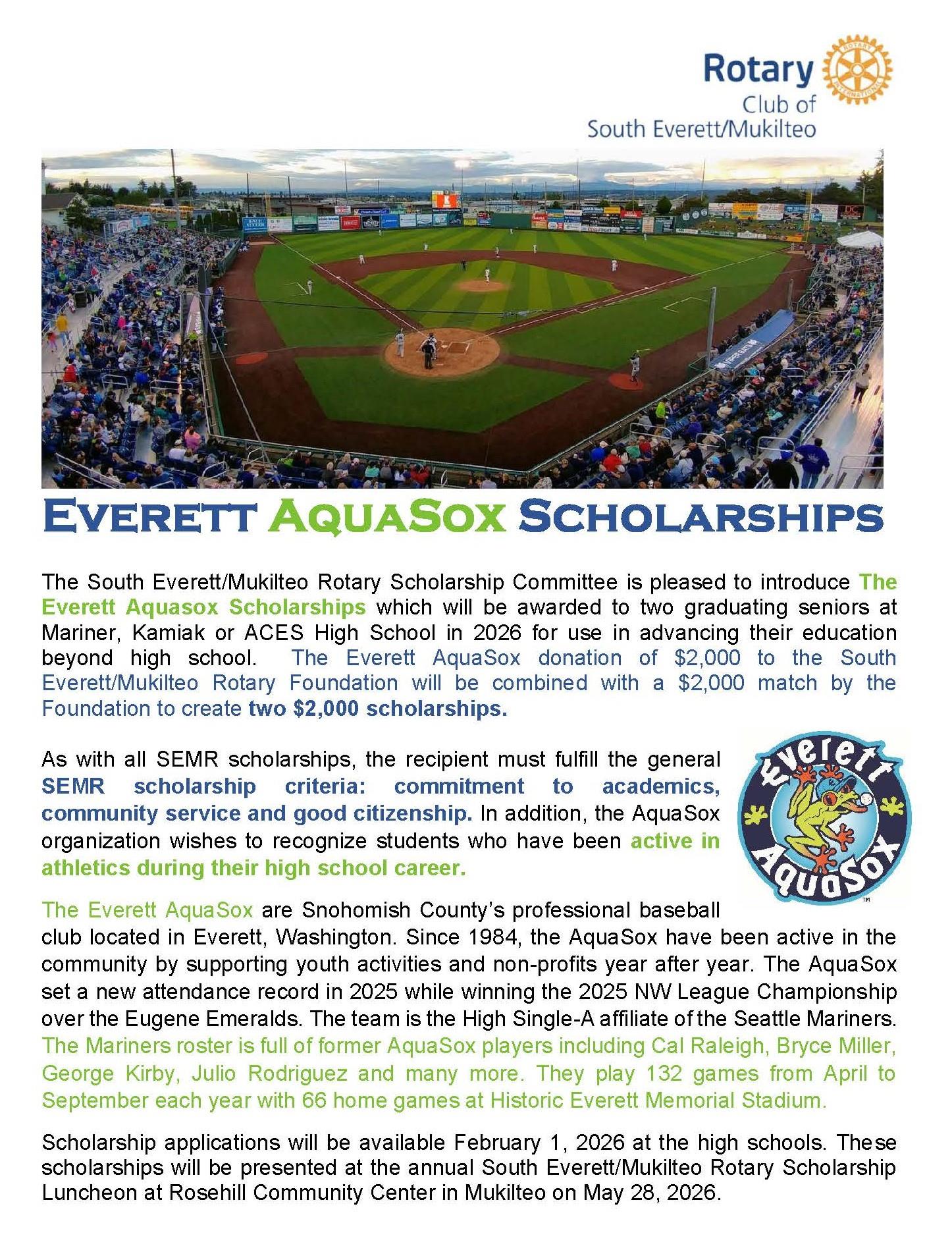The Rotary Club of South Everett Mukilteo Foundation plans to distribute over $80,000 in academic scholarships in 2026 to high school seniors from Kamiak, Mariner, and Aces High Schools who plan to further their education at a 4-year college, community college or vocational training institution. Applications are available through high school counselors at each school.