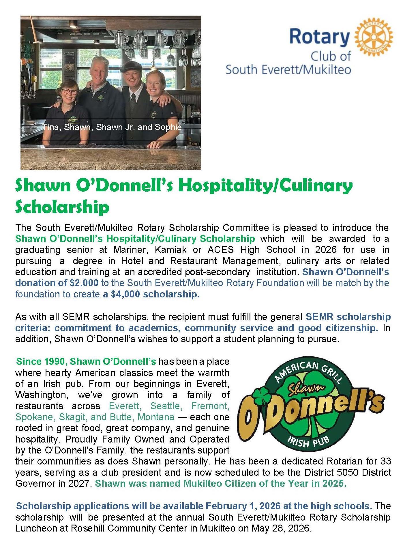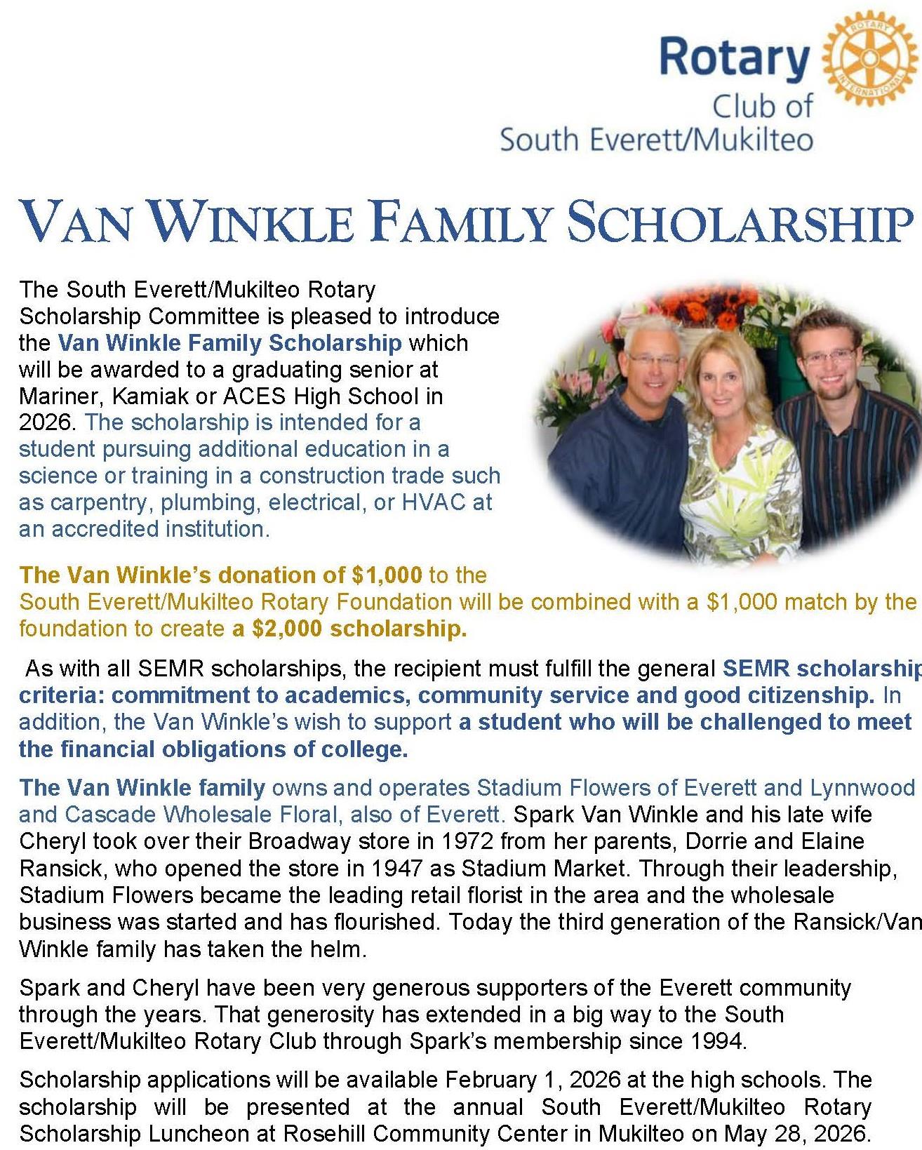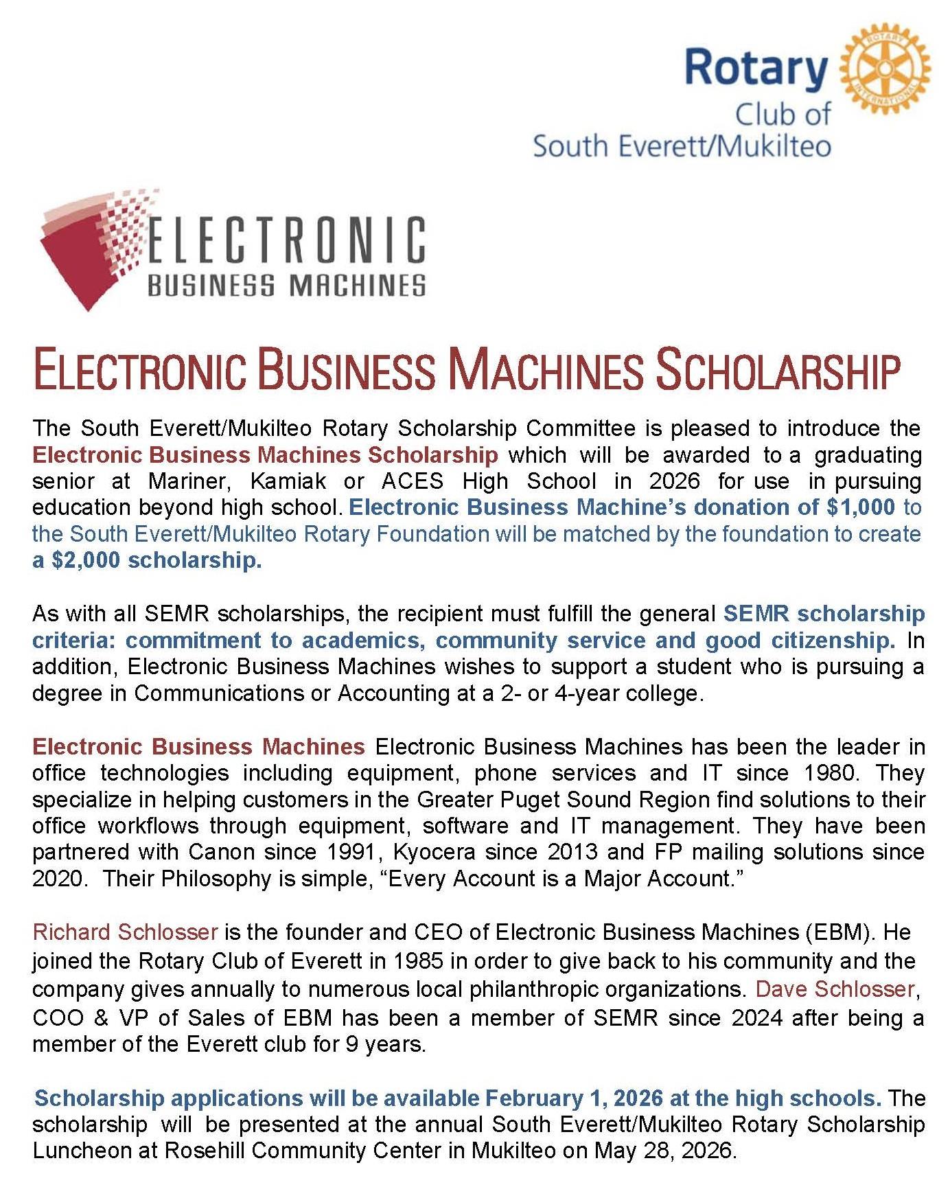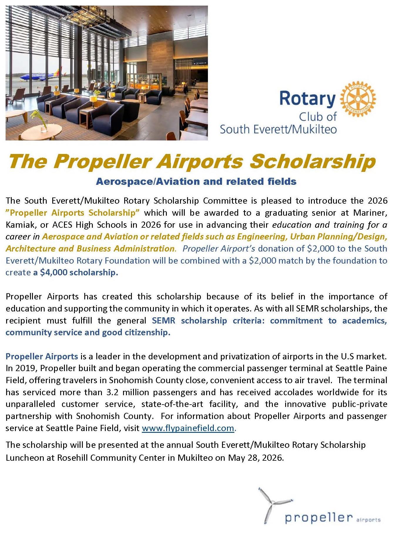 The Rotary Club of South Everett Mukilteo Foundation plans to distribute over $80,000 in academic scholarships in 2026 to high school seniors from Kamiak, Mariner, and Aces High Schools who plan to further their education at a 4-year college, community college or vocational training institution. Applications are available through high school counselors at each school.