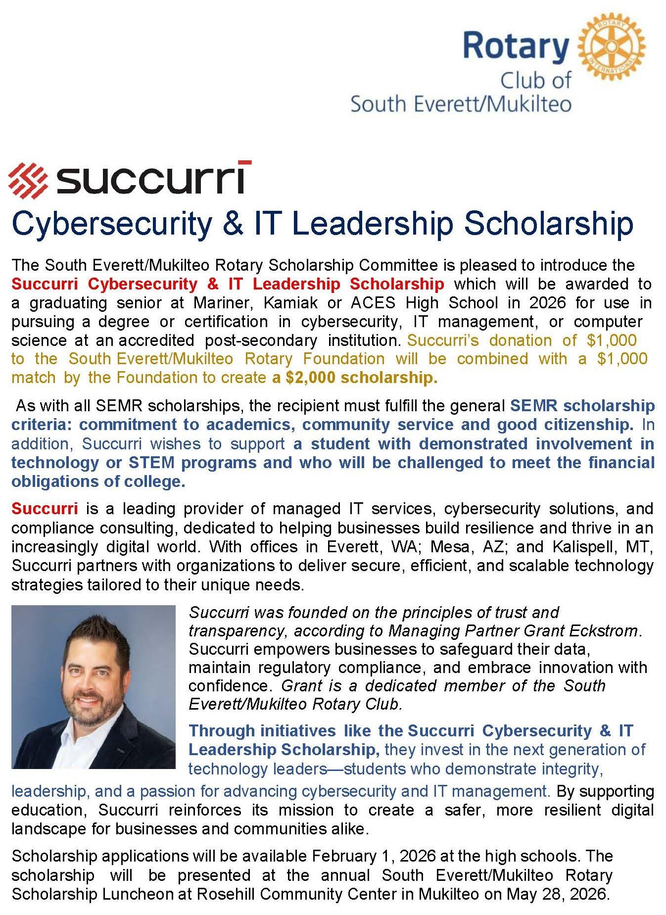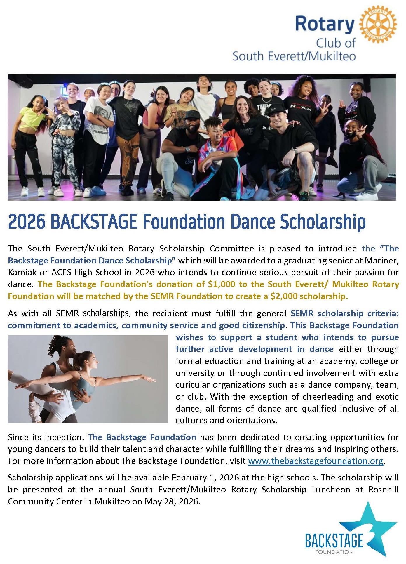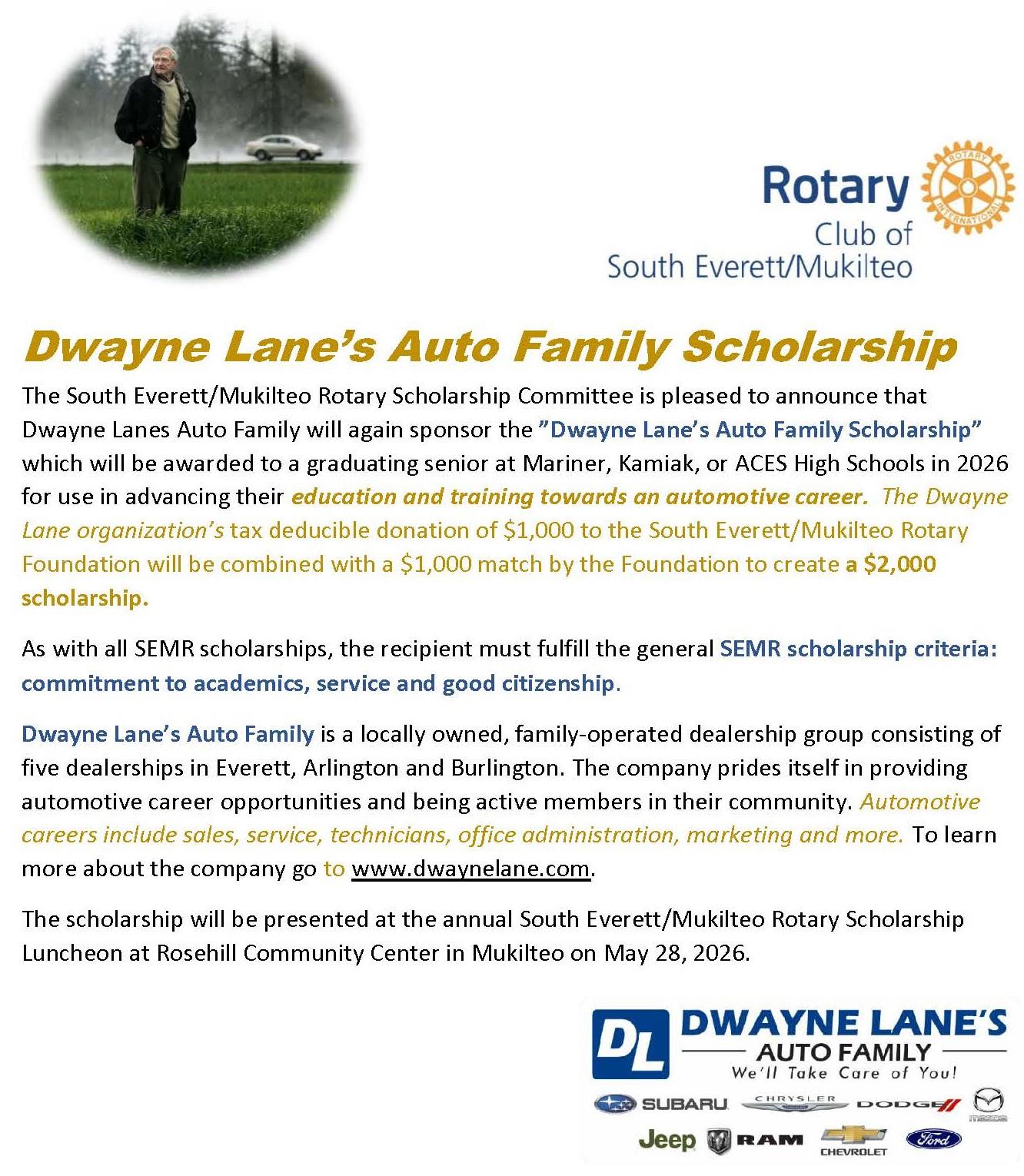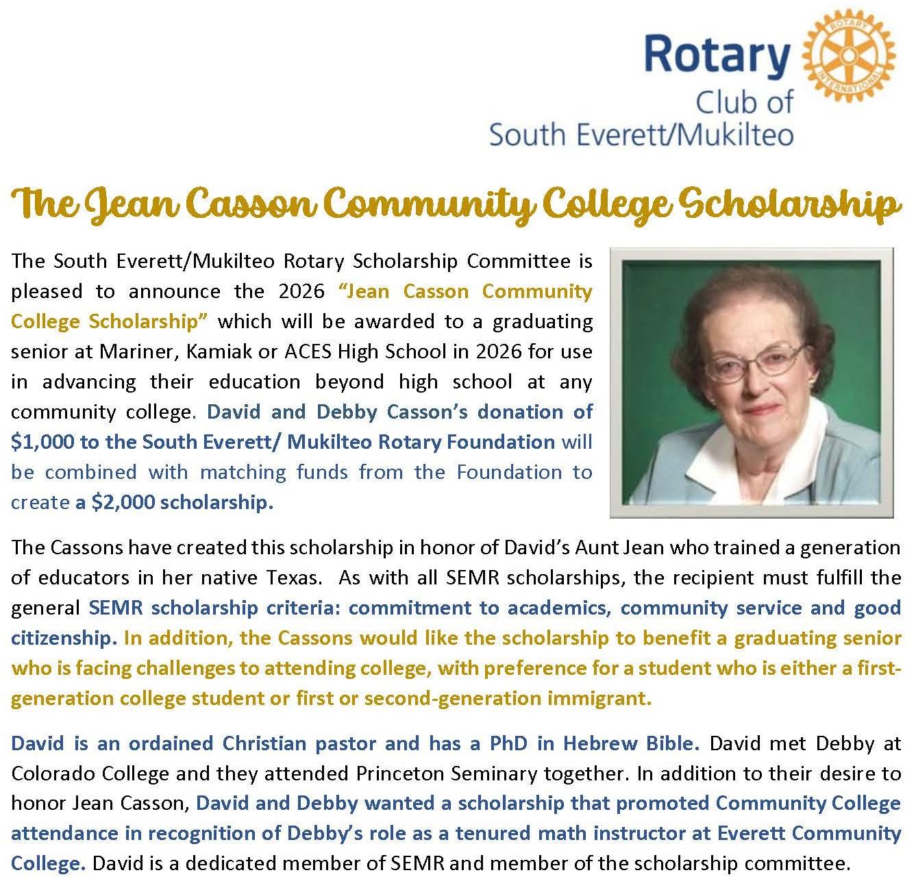 The Rotary Club of South Everett Mukilteo Foundation plans to distribute over $80,000 in academic scholarships in 2026 to high school seniors from Kamiak, Mariner, and Aces High Schools who plan to further their education at a 4-year college, community college or vocational training institution. Applications are available through high school counselors at each school.